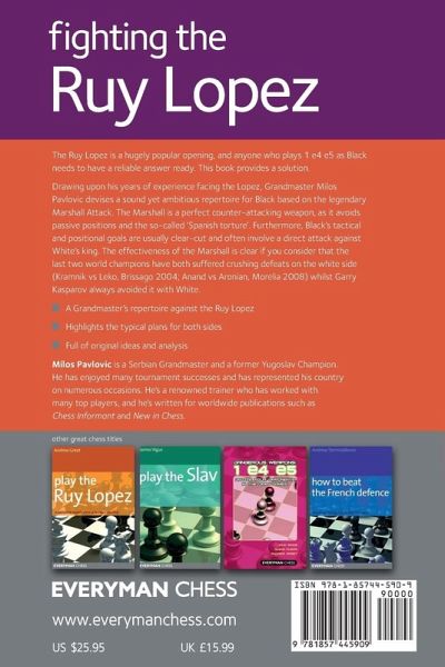 The Ruy Lopez is a hugely popular opening, and anyone who plays 1 e4 e5 as Black needs to have a reliable answer ready. This book provides a solution. Drawing upon his years of experience facing the Lopez, Grandmaster Milos Pavlovic devises a sound yet ambitious repertoire for Black based on the legendary Marshall Attack. The Marshall is a perfect counter-attacking weapon, as it avoids passive positions and the so-called 'Spanish torture'. Furthermore, Black's tactical and positional goals are usually clear-cut and often involve a direct attack against White's king. The effectiveness of the Marshall is clear if you consider that the last two world champions have both suffered crushing defeats on the white side (Kramnik vs Leko, Brissago 2004; Anand vs Aronian, Morelia 2008) whilst Garry Kasparov always avoided it with White.