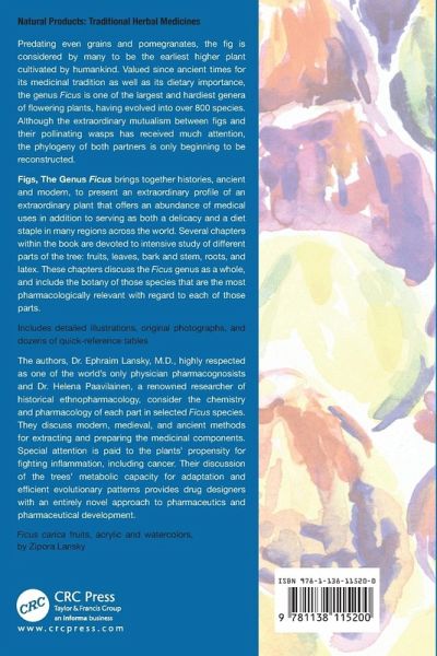 With a history as ancient as any cultivated fruit, many believe the fig has been with us even longer than the pomegranate. The Ficus constitutes one of the largest and hardiest genera of flowering plants featuring as many as 750 species. Although the extraordinary mutualism between figs and their pollinating wasps has received much attention, the phylogeny of both partners is only beginning to be reconstructed. The fig plant does have a long history of traditional use as a medicine and has been a subject of significant modern research. Figs, the Genus Ficus brings together those histories, ancient and modern, to present an extraordinary profile of an extraordinary plant with an abundance of medical uses and a reputation as both a delicacy and a diet staple in some regions of the world. Several chapters within the book are devoted to intensive study of different parts of the tree: fruits, leaves, bark and stem, roots, and latex. These chapters discuss the Ficus genus as a whole, including the botany of the most important species that have been related to that particular part pharmacologically. The authors, Dr. Ephraim Lansky MD, highly respected as one of the world's only physician pharmcognocists and Dr. Helena Paavilainen, a renowned researcher of natural products, go on to consider the chemistry and pharmacology of each part in selected Ficus species, and modern, medieval, and ancient methods for obtaining and preparing the beneficial components from that plant part for medicinal use. Special attention is paid to the plants' propensity for fighting inflammation, including cancer. Figs' future potential is considered in a number of treatments, as are future areas of research. Includes a wealth of comparative tables for quick reference Provides dozens of illustrative and original high-quality photos as well as drawings and chemical structures Offers complete references after every chapter Figs, the Genus Ficus is a book in the CRC Press Series, Traditional Herbal Medicines for Modern Times, edited by Roland Hardman. Each volume in this series provides academia, health sciences, and the herbal medicines industry with in-depth coverage of the herbal remedies for infectious diseases, certain medical conditions, or the plant medicines of a particular country. Figs, the Ficus trees, are an understudied genus in modern pharmacognosy. This book present a multidisciplinary approach to the botany, chemistry, and pharmacology of fig trees and figs of the Ficus species, including the fig of commerce, Ficus carica, the rubber tree, Ficus elastic, and the Bo tree, Ficus religiosa. Traditional and current uses of figs in medicine are discussed in detail. The book also explores how figs and fig tree parts are processed, and the pharmacological basis underlying the potential efficacy of preparations is investigated in relation to their chemical composition. The book moves seamlessly from mythology to botany to ethnomedicine to pharmacology to phytochemistry.