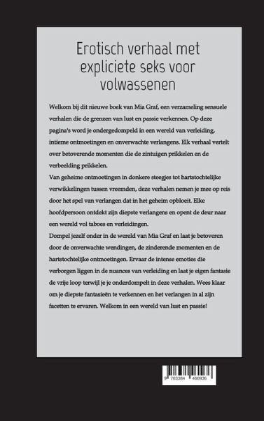 Welkom bij dit nieuwe boek van Mia Graf, een verzameling sensuele verhalen die de grenzen van lust en passie verkennen. Op deze pagina's word je ondergedompeld in een wereld van verleiding, intieme ontmoetingen en onverwachte verlangens. Elk verhaal vertelt over betoverende momenten die de zintuigen prikkelen en de verbeelding prikkelen.Van geheime ontmoetingen in donkere steegjes tot hartstochtelijke verwikkelingen tussen vreemden, deze verhalen nemen je mee op reis door het spel van verlangen dat in het geheim opbloeit. Elke hoofdpersoon ontdekt zijn diepste verlangens en opent de deur naar een wereld vol taboes en verleidingen.Het boek bevat expliciete seksuele inhoud en is niet geschikt voor jongeren onder de 18 jaar. De verhalen zijn pure fantasie: de personages zijn allemaal meerderjarig en, net als de inhoud, fictief.Dompel je onder in de wereld van Mia Graf en laat je betoveren door de onverwachte wendingen, de zinderende momenten en de hartstochtelijke ontmoetingen. Ervaar de intense emoties die verborgen liggen in de nuances van verleiding en laat je eigen fantasie de vrije loop terwijl je je onderdompelt in deze verhalen. Wees klaar om je diepste fantasieën te verkennen en het verlangen in al zijn facetten te ervaren. Welkom in een wereld van lust en passie!