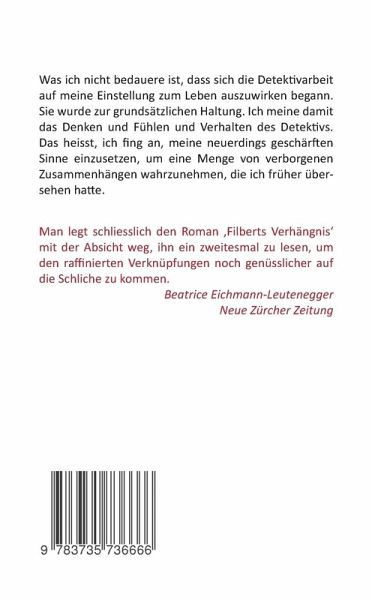In einer gesitteten Stadt der ordentlichen Schweiz spielt sich ein rätselhafter Mordfall ab, dessen Aufklärung zwanzig Jahre dauert. Die Hauptpersonen sind vier alte Schulfreunde, die sich stets noch zum wöchentlichen Stammtisch treffen: der Polizist Wiederkehr, der Linkspolitiker und Journalist Filbert - das Mordopfer -, der erfolgreiche Wirtschaftsanwalt Brauer und der Tierwärter Stöckli. Wiederkehr hat sich nach seiner vorzeitigen Pensionierung in ein abgelegenes Dorf auf der Alpensüdseite zurückgezogen. In einem umfassenden Bericht an die Staatsanwaltschaft erzählt er, wie er den Fall Filbert gelöst hat.