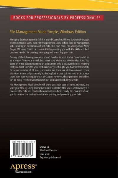 Managing data is an essential skill that every PC user should have. Surprisingly though, a large number of users--even highly experienced users--exhibit poor file management skills, resulting in frustration and lost data. This brief but invaluable book, File Management Made Simple can resolve this by providing you with the skills and best practices needed for creating, managing and protecting your data.
