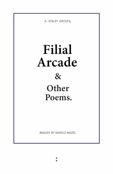Filial Arcade & Other Poems is a book of poetry; a fusion of images and memories of a family, trees, piety, love, the sea, dying, animal life, video tapes, forests. The book is prefaced with images by Marco Mazzi.