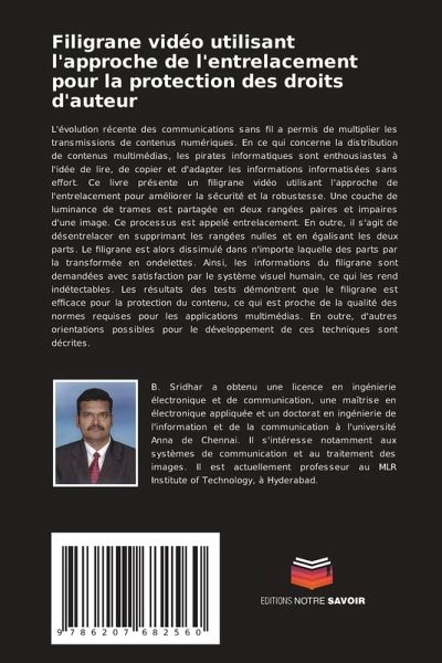 L'évolution récente des communications sans fil a permis de multiplier les transmissions de contenus numériques. En ce qui concerne la distribution de contenus multimédias, les pirates informatiques sont enthousiastes à l'idée de lire, de copier et d'adapter les informations informatisées sans effort. Ce livre présente un filigrane vidéo utilisant l'approche de l'entrelacement pour améliorer la sécurité et la robustesse. Une couche de luminance de trames est partagée en deux rangées paires et impaires d'une image. Ce processus est appelé entrelacement. En outre, il s'agit de désentrelacer en supprimant les rangées nulles et en égalisant les deux parts. Le filigrane est alors dissimulé dans n'importe laquelle des parts par la transformée en ondelettes. Ainsi, les informations du filigrane sont demandées avec satisfaction par le système visuel humain, ce qui les rend indétectables. Les résultats des tests démontrent que le filigrane est efficace pour la protection du contenu, ce qui est proche de la qualité des normes requises pour les applications multimédias. En outre, d'autres orientations possibles pour le développement de ces techniques sont décrites.