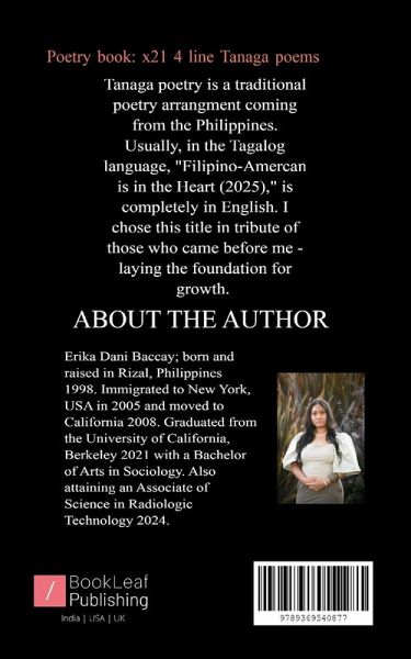 Tanaga poetry is a traditional poetry arrangement coming from the Philippines. Usually, in the Tagalog language, "Filipino-American is in the Heart (2025)," is completely in English. I chose this title in tribute of those who came before me - laying the foundation for growth.