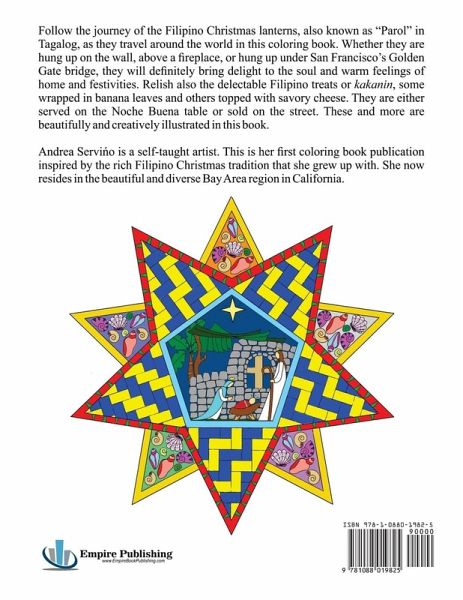 Follow the journey of the Filipino Christmas lanterns, also known as "Parol" in Tagalog, as they travel around the world in this coloring book. Whether they are hung up on the wall, above a fireplace, or hung up under San Francisco's Golden Gate bridge, they will definitely bring delight to the soul and warm feelings of home and festivities. Relish also the delectable Filipino treats or kakanin, some wrapped in banana leaves and others topped with savory cheese. They are either served on the Noche Buena table or sold on the street. These and more are beautifully and creatively illustrated in this book. Andrea Servi¿o is a self-taught artist. This is her first coloring book publication inspired by the rich Filipino Christmas tradition that she grew up with. She now resides in the beautiful and diverse Bay Area region in California.