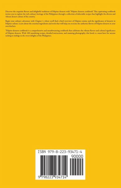 Discover the exquisite flavors and delightful traditions of Filipino desserts with "Filipino desserts cookbook" This captivating cookbook invites you to explore the rich culinary heritage of the Philippines through a collection of delectable recipes that highlight the diverse and vibrant dessert culture of the country. Begin your culinary adventure with Chapter 1, where you'll find a brief overview of Filipino cuisine and the significance of desserts in Filipino culture. Learn about the essential ingredients and tools that will help you recreate the authentic flavors of Filipino desserts in your own kitchen. "Filipino desserts cookbook is a comprehensive and mouthwatering cookbook that celebrates the vibrant flavors and cultural significance of Filipino desserts. With 100 tantalizing recipes, detailed instructions, and stunning photography, this book is a must-have for anyone seeking to indulge in the sweet delights of the Philippines.