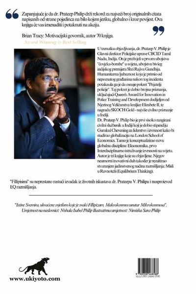 "Zapanjuju¿e je da dr. Prateep Philip dri rekord za najve¿i broj originalnih citata napisanih od strane pojedinca na bilo kojem jeziku, globalno i kroz povijest. Ova knjiga de vas iznenaditi i potaknuti na akciju " Brian Tracy: Motivacijski govorik, autor 70 knjiga U trenutku objavljivanja, dr. Prateep V Philipje Glavni direktor Policijske uprave CBCID Tamil Nadu, Indija. On je preivjeli u prvom ubojstvu "Bovjeka-bombe" u svijetu, ubojstvu biveg indijskog premijera Shri Rajiv Gandhij Humanitarna ljubaznost koju je primio od nepoznatog gradanina nakon tog incidenta potaknula ga je da osnuje pokret "Prijatelji policije. Taj pokret je dobio brojna priznanja, uklju¿ujuci Queen's Award for Innovation in Police Training and Development dodijeljen od Njezinog Veli¿anstva kraljice Elizabete II, te nagradu SKOCH Gold-najvie civilno priznanje u Indiji Dr. Prateep V. Philip bio je prvi visoko rangirani avilni slubenik u Indiji koji je dobio stipendiju Gurukul Chevening za liderstvo i izvrsnost kako bi studirao globalizaciju na London School of Economics. Tamo je konceptualizirao novu globalnu disciplinar Eksonomika, prvo Interdisciplinamo istraivanje izvrsnosti na svijetu. Autor je tri knjige koje su objavljene. Njegov neumomi inovativni duh takoder je rezultirao stvaranjan jedinstvenog näina ramljanja: Misli u Ravnoteh (Equilibrium Thinking) "Fillipisim" su neprestano rastu izvadak iz ivotnih iskustava dr. Pratopa V. Philipa i nusproizvod EQ razmisljanja.