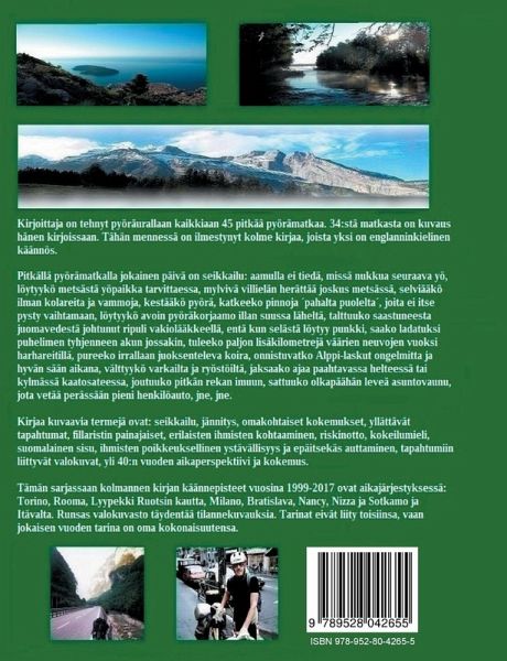 Palautetta lukijoilta Jussin kirjat pitävät otteessan alkusivuilta lähtien, jännittäviä kokemuksia, elävää kerrontaa, kuin olisi itse mukana seikkailuissa. Jännittävät tapahtumat, kokeilun halu ja riskinotto luovat pääsisällön kirjoihin. Mielenkiintoisia erilaisten ihmisten tapaamisia on paljon. Yöpyminen campingalueilla ja metsässä hotelliöiden sijasta kiehtoo. Kirjan puhekieli lisää autenttisuutta. Kirjassa korostuu ihmisten ystävällisyys ja epäitsekäs auttamishalu. Kirja on kuvaus luottamisesta ja rohkeudesta. Mukaansa tempaava, jännittävä matkakertomus, kuinka selviää vaikeistakin tilanteista. Monista matkatuttavista tulee pysyviä ystäviä. Jussin avoin suhtautuminen toisiin kulttuureihin näkyy. Jussin tapa kirjoittaa on jouhevaa ja rentouttavaa luettavaa. Matkojen rasitukset jäävät taka-alalle, enemmän korostuu erilaiset tapahtumat ja sattumat. Monta jännää läheltä piti tilanteita sisältyy kertomuksiin. Mukana on runsaasti loistavia, isokokoisia värikuvia. Odotan mielenkiinnolla jatko-osia. Jussi kirjoittaa elävästi ja tuoreesti myös vuosikymmenten takaisista tapahtumista lähteenään tarkat matkamuistiot. Jännittäviä tapahtumia ja hankalista tilanteista selviytymistä, aivan huikeaa. Matkojen kuvaus on niin elävää, kuin olisi itse mukana matkalla. Todella ilmastoystävällistä matkantekoa. Suosittelen. Jussin teos saa lukijankin kaipaamaan tien päälle. Hänen kirjansa mukana pääsee eläytymään mm. rautaesirippuajan Eurooppaan, rajatarkastuksiin ja kielimuureihin, aikaan, joka on oikeasti jo historiaa, mutta herää kertomuksissa eloon. Kirja vie Eurooppaan, joka tuntuu inhimilliseltä. Siinä missä paikoin campingalueet kohtelevat polkijaa kurjasti, sitäkin suurempaa ystävällisyyttä tulee eteen silloin, kun sitä vähiten odottaa. Välistä melkein kauhistuttaa, kuinka vähän Jussi reissuillaan syö ja lepää. Ajoittain viimeisetkin voimat on poljettu loppuun, matka-budjetti viimeisillään ja ravinnon tankkaaminen sivuseikka. Päivämatkat ovat välillä hurjia. Jussi nukkuu tarpeen tullen taivasalla, vaikka pääosin yöt sentään teltassa c-alueilla tai ystävällisten ihmisten pihapiireissä. Todellista ympäristöystävällistä matkailua minibudjetilla. Kertomukset ovat aitoja ja konstailemattomia. Jussi ei jaarittele turhia. Rivit ovat syntyneet kynttilän valossa pitkän matkapäivän jälkeen. On antoisaa kohdata Jussin kanssa uusia tuttavuuksia, hoiperrella kuun valossa väsyneenä metsätiellä tai nauttia yhä uusien kaupungkien nähtävyyksistä ja sykähdyttävistä maisemista.