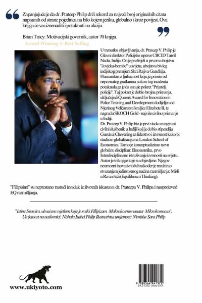 "Zapanjujüe je da dr. Prateep Philip dri rekord za najve¿i broj originalnih citata napisanih od strane pojedinca na bilo kojem jeziku, globalno i kroz povijest. Ova knjiga de vas iznenaditi i potaknuti na akciju " Brian Tracy: Motivacijski govorik, autor 70 knjiga U trenutku objavljivanja, dr. Prateep V Philipje Glavni direktor Policijske uprave CBCID Tamil Nadu, Indija. On je preivjeli u prvom ubojstvu "Bovjeka-bombe" u svijetu, ubojstvu biveg indijskog premijera Shri Rajiv Gandhij Humanitarna ljubaznost koju je primio od nepoznatog gradanina nakon tog incidenta potaknula ga je da osnuje pokret "Prijatelji policije. Taj pokret je dobio brojna priznanja, ukljüujuci Queen's Award for Innovation in Police Training and Development dodijeljen od Njezinog Veli¿anstva kraljice Elizabete II, te nagradu SKOCH Gold-najvie civilno priznanje u Indiji Dr. Prateep V. Philip bio je prvi visoko rangirani avilni slubenik u Indiji koji je dobio stipendiju Gurukul Chevening za liderstvo i izvrsnost kako bi studirao globalizaciju na London School of Economics. Tamo je konceptualizirao novu globalnu disciplinar Eksonomika, prvo Interdisciplinamo istraivanje izvrsnosti na svijetu. Autor je tri knjige koje su objavljene. Njegov neumomi inovativni duh takoder je rezultirao stvaranjan jedinstvenog näina ramljanja: Misli u Ravnoteh (Equilibrium Thinking) "Fillipisim" su neprestano rastu izvadak iz ivotnih iskustava dr. Pratopa V. Philipa i nusproizvod EQ razmisljanja.
