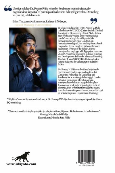"Utroligt nok har Dr. Prateep Philip rekorden for de mest originale citater, der nogensinde er skrevet af en person på et hvilket som helst sprog i verden. Denne bog vil ryste dig ud af din inerti. Brian Tracy: motivationstræner, forfatter til 70 bøger. Arcand Woming Best Selling " Plgeleider er Dr. Praep V. Philip politidirektor for CBCID (Crime Branch Criminal Investigation Department) i Tamil Nadu, Indien Han overlevede verdens første "menneskelige bombe-mordet på den tidligste indiske premierminister Shri Rajiv Gandhi. Den humanitere venlighed, han modtog fra en ukendt bonger efter denne hendelse, fik ham til at skabe bevægelsen "Friends of the Police". Denne bevægelse har modtager adskillige priser, herunder Queen's Award for Innovation in Police Training and Development fra Hendes Majestet Dronning Elizabeth II, samt SKOCH Gold Award-den hajeste civile pris, der uaffengt er indstifter Indien. Dr. Prateep V Philip var den første hottiende embedsmand i Indien, der modrog Gurukul Chevening Fellowship for Leadership and Excellence for at studere globalisering på London School of Economics Mens han var der, konceptualiserede hun en ny global disciplin- Excenomics, verdens første verfaglige studie af ekspertise. Han er forfatter til tre udgivne bøger. Som den innovative person han er, dabee han også en unik tankeproces - Equilibrium Thinking "Fillipsis" er et stadigt voksende uddrag af Dr. Prateep V Philips livserfaringer og et biprodukt af hars EQ-king
