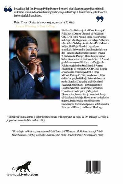 "weklaq li d-Dr. Prateep Philip jiomm il-rekord g¿al aktar cituzzjonijiet originali miktubin minn individhwu b'xi lingwa fid-dinja u fl-estorja. Din il-ktieb sejsbukkomu jinkoragilek li tindirizza Brian Tracy: Oratur ta' motivazzjoni, awtur ta' 70 ktieb." Fil-hin ta' ipubblikazzjoni, id-Dott. Prateep V Philip huwa Direttur Generali tal-Pulizija tal- CBCID fil-Tamil Nadu, India. Huwa wiched mill-hain li ha l-haja wara l-ewwel qtil ta' bomba tal-bniedem fid-dinja, il-qtil tal-eks Prim Ministru Indjan, Shri Rajiv Gandhi. L-gentilezza umanitarja li riceva minn cittadin mghael war dan l-incident g¿addietu biex jikkreat-twaqqif "Ghalliema tal-Pulizija" Din it-twaqqif irceva hafna rikonoxximenti, fosthom il-Queen's Award g¿all-Innovazzjoni fil-Hidma u t-Thejjija tal- Pulizija moghti minn Sua Maestà il-Regina Elizabeth II. ul-premju SKOCH Gold-Foghia onorevolezza civili indipendenti l-Indja Id-Dott. Prateep V. Philip kien l-ewwel ufficial civili ta' rango g¿oli fl-Indija li neva il-borsa ta studju Gurukul Chevening ghall-Gwida ul Eccellenza biex jistudja l-globalizzazzjoni fil- London School of Economics Hawnhekk, koncettwalizza disciplina adida globalt Eksonomika, Fewwel Studju Interdisciplinarju tal-Exellenza fid-dinja. Huwa awtur ta' thet kothu mqarba Ruhu bhekk, bimod incessanti innovazzjoni, ikkna wkoll process ta' tahsis unikut Tas-Sens ta' Bilanc (Equilibrium Thinking) "Fillipisima huma estratt li jikber kontinwament mill-esperjenzi ta' hajtu ta' Dr. Prateep V. Philip u jipproduciminn it-tädit tal-¿sieb EQ
