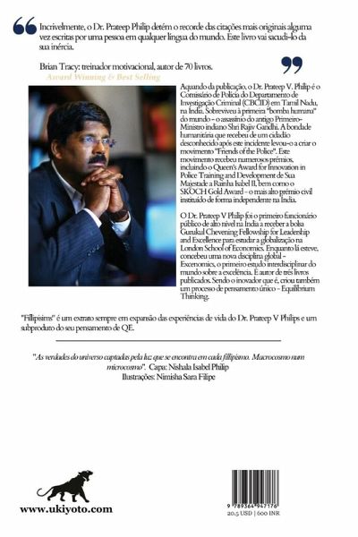 "Incrivelmente, o Dr. Prateep Philip detém o recorde das citações mais originais alguma vez escritas por uma pessoa em qualquer lingua do mundo. Este livrov o vai sacudi-lo da sua inércia Brian Tracy: treinador motivacional, autor de 70 livros Aquindo da publicação, o Dr. Prateep V. Philip é o Comissário de Policia do Departamento de Investigação Criminal (CBCID) em Tamil Nadu, ra India Sobreviveu à primeira "bomba humana do mundo-o assinio do antigo Primeiro- Ministro indano Shri Rajiv Gandhi A bondade humanitiria que recebeu de um cididio desconhecido após este incidente levou-o a criar o movimento Friends of the Police". Este movimento recebeu numerosos prémios, incluindo o Queen's Award for Innovation in Police Training and Development de Sa Majestade a Rainha label 11, bem como o SKOCH Gold Award-o mais alto prémio civil instituido de forma independente na India OD. Praeep V Philip foi o primeiro funcionário publico de aho nivel na India a receber a boka Gurukul Chevening Fellowship for Leadership and Excellence para estudar a globalização na London School of Economics Enquanto li esteve. concebeu uma nova disciplina global- Excenomics o primeiro estudo interdisciplinar do mundo sobre a excelencia É autor de tres livros publicados. Sendo o inovador que é, criou também um proceso de pensamento único - Equilibrium Thinking "Filipins" é um exaro sempre em expansão das experiencias de vida do Dr. Pransep V Philips e um subproduto do seu pensamento de QE