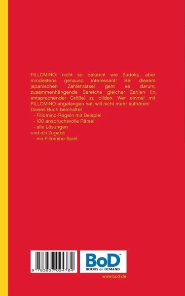 FILLOMINO: nicht so bekannt wie Sudoku, aber mindestens genauso interessant! Bei diesem japanischen Zahlenrätsel geht es darum, zusammenhängende Bereiche gleicher Zahlen (in entsprechender Größe) zu bilden. Wer einmal mit FILLOMINO angefangen hat, will nicht mehr aufhören!Dieses Buch beinhaltet - Fillomino-Regeln mit Beispiel - 100 anspruchsvolle Rätsel - alle Lösungenund als Zugabe - ein Fillomino-Spiel