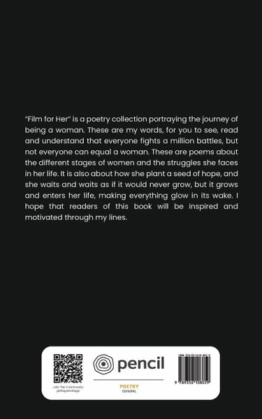 "Film for Her" is a poetry collection portraying the journey of being a woman. These are my words, for you to see, read and understand that everyone fights a million battles, but not everyone can equal a woman. These are poems about the different stages of women and the struggles she faces in her life. It is also about how she plant a seed of hope, and she waits and waits as if it would never grow, but it grows and enters her life, making everything glow in its wake. I hope that readers of this book will be inspired and motivated through my lines.