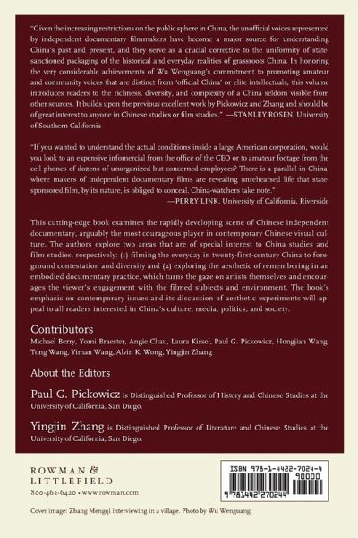 Acknowledgments Part I: Cultural Context 1. Introduction: Documenting China Independently, by Paul G. Pickowicz and Yingjin Zhang 2. Who's Afraid of the Documentary Camera? Refiguring Reality, Memory, and Power in Chinese Independent Documentary, by Yingjin Zhang 3. For Whom Does the Director Speak? The Ethics of Representation in Documentary Film Criticism, by Yomi Braester, Part II: Rural Reconfigurations 4. From Root-Searching to Grassroots: Returning to the Countryside in Contemporary Chinese Fiction and Independent Documentary Film, by Angie Chau 5. Zou Xueping's Postsocialist Homecoming, by Paul G. Pickowicz Part III: Embodied Filmmaking 6. Looking Back while Marching Forward: Reconfiguration of Selfhood in the Folk Memory Project, by Tong Wang 7. The Memory Projectand Other Ways of Knowing: Filmmaking, Affect, and Embodied Knowledge, by Laura Kissel Part IV: Documentary Enactments 8. Gendering Intersubjectivity in New Chinese Documentary: Feminist Multiplicity and Vulnerable Masculinity in Postsocialist China, by Alvin Wong 9. From Bumming to Roaming: Xu Tong's The Drifters Trilogy, by Yiman Wang 10. Documenting through Reenacting: Revisiting the Performative Mode in Chinese Independent Documentaries, by Hongjian Wang Appendix: Michael Berry, "Memory/Document: In Dialogue with Wu Wenguang's Memory Project" Documentary Filmography About the Contributors