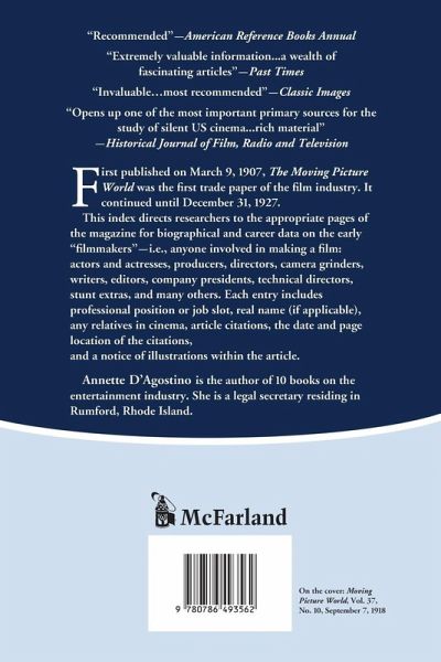 First published on March 9, 1907, The Moving Picture World was the first trade paper of the film industry. It continued until December 31, 1927. This index directs researchers to the appropriate pages of the magazine for biographical and career data on the early ""filmmakers""--i.e., anyone involved in making a film: actors and actresses, producers, directors, camera grinders, writers, editors, company presidents, technical directors, stunt extras, and many others. Each entry includes professional position or job slot, real name (if applicable), any relatives in cinema, article citations, the date and page location of the citations, and a notice of illustrations within the article.