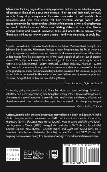 Filmmakers Thinking begins from a simple premise: that we do not take the ongoing reflections of filmmakers about their medium, their art and their craft, seriously enough. Every day, everywhere, filmmakers are asked to talk mainly about themselves and their own works. Yet their vocation springs from a deep engagement with the history and possibilities of cinema as a whole. Going beyond the usual, oft-cited sources, Filmmakers Thinking delves into a vast archive of writings (public and private), interviews, talks, and anecdotes to discover what filmmakers think about how to create cinema - and what cinema is, or could be.
