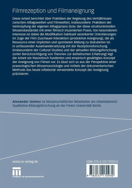 Die Überlegungen und Untersuchungen in dieser Arbeit berichten über Praktiken der Regelung des Verhältnisses zwischen Alltagswelten und Filmwelten; insbesondere: Praktiken der Verknüpfung zwischen einer filmisch inszenierten Praxis und der selbst erlebten Alltagspraxis bzw. der diese Alltagspraxis strukturierenden Wissensbestände. Von besonderem Interesse ist dabei die Transformation habituell verankerter Orientierungen im Zuge der Film-Zuschauer-Interaktion, die als Ressource einer impliziten Selbstbildung zu verstehen ist. In umfassender Auseinandersetzung mit der aktuellen Rezeptionsforschung und der Bildungsforschung unter Berücksichtigung der Theorien zur ästhetischen Erfahrung legt die Arbeit ein theoretisch fundiertes und empirisch gesättigtes Konzept der Aneignung von Filmen vor.