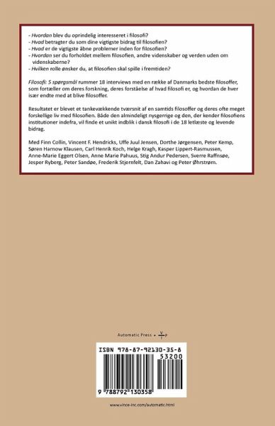 Filosofi: 5 spørgsmål rummer 18 interviews med en række af Danmarks bedste filosoffer, som fortæller om deres forskning, deres forståelse af hvad filosofi er, og hvordan de hver især endte med at blive filosoffer. Resultatet er blevet et tankevækkende tværsnit af en samtids filosoffer og deres ofte meget forskellige liv med filosofien. Både den almindeligt nysgerrige og den, der kender filosofiens institutioner indefra, vil finde et unikt indblik i dansk filosofi i de 18 letlæste og levende bidrag. Med Finn Collin, Vincent F. Hendricks, Uffe Juul Jensen, Dorthe Jørgensen, Peter Kemp, Søren Harnow Klausen, Carl Henrik Koch, Helge Kragh, Kasper Lippert-Rasmussen, Anne-Marie Eggert Olsen, Anne Marie Pahuus, Stig Andur Pedersen, Sverre Raffnsøe, Jesper Ryberg, Peter Sandøe, Frederik Stjernfelt, Dan Zahavi og Peter Øhrstrøm.