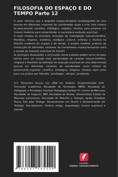 O autor mostrou que a biografia espaço-temporal (autobiografia) de uma pessoa em diferentes sistemas de coordenadas ajuda a criar uma síntese do pensamento: científico, mitológico, religioso, intuitivo, para preparar um homem moderno para compreender a sua própria evolução espiritual.O autor revelou as principais direcções da investigação natural-científica, filosófica, religiosa, esotérica, teológica, cultural, artística e intuitiva na filosofia moderna do espaço e do tempo, e propôs modelos práticos de construção de diferentes sistemas de coordenadas espaço-temporais para o estudo da evolução espiritual do homem. As principais disposições e conclusões deste trabalho podem servir de base teórica para um estudo mais aprofundado de carácter natural-científico, religioso e filosófico da definição da evolução espiritual de uma determinada pessoa em diferentes sistemas de coordenadas como síntese do pensamento cognitivo: científico, mitológico, religioso, intuitivo, bem como para uso prático por filósofos, psicólogos, clérigos, jornalistas.