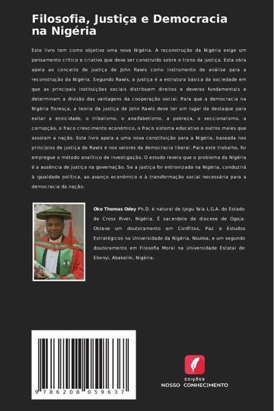 Este livro tem como objetivo uma nova Nigéria. A reconstrução da Nigéria exige um pensamento crítico e criativo que deve ser construído sobre o trono da justiça. Esta obra apela ao conceito de justiça de John Rawls como instrumento de análise para a reconstrução da Nigéria. Segundo Rawls, a justiça é a estrutura básica da sociedade em que as principais instituições sociais distribuem direitos e deveres fundamentais e determinam a divisão das vantagens da cooperação social. Para que a democracia na Nigéria floresça, a teoria da justiça de John Rawls deve ter um lugar de destaque para evitar a etnicidade, o tribalismo, o analfabetismo, a pobreza, o seccionalismo, a corrupção, o fraco crescimento económico, o fraco sistema educativo e outros males que assolam a nação. Este livro apela a uma nova constituição para a Nigéria, baseada nos princípios de justiça de Rawls e nos valores da democracia liberal. Para este trabalho, foi empregue o método analítico de investigação. O estudo revela que o problema da Nigéria é a ausência de justiça na governação. Se a justiça for entronizada na Nigéria, conduzirá à igualdade política, ao avanço económico e à transformação social necessária para a democracia da nação.