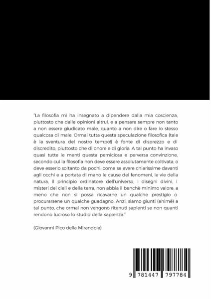 "La filosofia mi ha insegnato a dipendere dalla mia coscienza, piuttosto che dalle opinioni altrui, e a pensare sempre non tanto a non essere giudicato male, quanto a non dire o fare io stesso qualcosa di male. Ormai tutta questa speculazione filosofica (tale è la sventura del nostro tempo!) è fonte di disprezzo e di discredito, piuttosto che di onore e di gloria. A tal punto ha invaso quasi tutte le menti questa perniciosa e perversa convinzione, secondo cui la filosofia non deve essere assolutamente coltivata, o deve esserlo soltanto da pochi: come se avere chiarissime davanti agli occhi e a portata di mano le cause dei fenomeni, le vie della natura, il principio ordinatore dell'universo, i disegni divini, i misteri dei cieli e della terra, non abbia il benchè minimo valore, a meno che non si possa ricavarne un qualche prestigio o procurarsene un qualche guadagno. Anzi, siamo giunti (ahimè) a tal punto, che ormai non vengono ritenuti sapienti se non quanti rendono lucroso lo studio della sapienza." (Giovanni Pico della Mirandola)