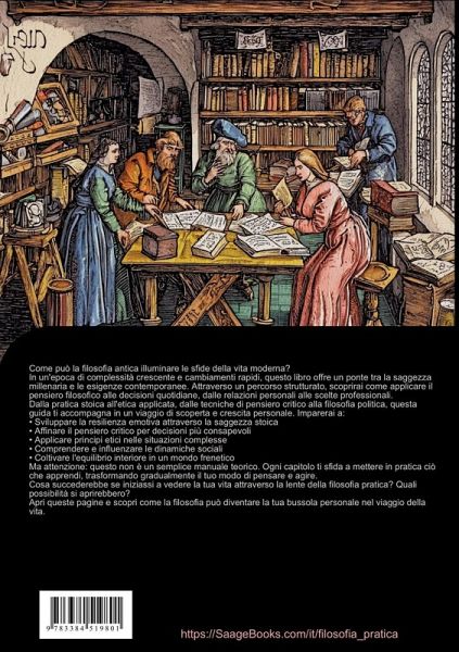 Questo libro offre un'introduzione completa alla filosofia pratica, rendendo accessibili i fondamenti di filosofia per tutti coloro che desiderano applicare il pensiero filosofico nella vita quotidiana.Il testo si sviluppa attraverso diversi ambiti della filosofia applicata, partendo dalle basi del pensiero critico e della logica filosofica fino ad arrivare all'applicazione pratica delle teorie dei grandi filosofi. Particolare attenzione viene dedicata agli studi di filosofia della prassi, che permettono di sviluppare strumenti concreti per affrontare le sfide della vita moderna.Il libro esplora:- Le fondamenta del pensiero filosofico e la sua applicazione pratica- L'importanza della saggezza stoica nella gestione delle emozioni e dello stress- Gli elementi essenziali della filosofia politica per comprendere la società contemporanea- Metodi pratici per sviluppare il pensiero critico e il ragionamento logico- L'applicazione dei principi filosofici nelle decisioni quotidianeQuesto volume rappresenta una guida pratica per:- Principianti che si avvicinano alla filosofia per la prima volta- Giovani menti interessate ad approfondire il pensiero filosofico- Lettori che cercano di applicare la filosofia nella vita di tutti i giorniAttraverso un linguaggio chiaro e accessibile, il testo offre una panoramica dei libri filosofici classici e delle loro applicazioni pratiche, rendendo la filosofia uno strumento concreto per la crescita personale e la comprensione del mondo.Ogni capitolo include esempi pratici, esercizi di riflessione e collegamenti con le sfide della vita moderna, trasformando concetti filosofici astratti in strumenti utili per il quotidiano.Questo libro è stato creato utilizzando tecnologie innovative come l'Intelligenza Artificiale e strumenti sviluppati appositamente - ad esempio, nella ricerca di idee, nella ricerca, nella scrittura, nella redazione, nel controllo qualità e nella progettazione di illustrazioni decorative.In questo modo, vogliamo offrirvi un'esperienza di lettura particolarmente coerente, moderna e di qualità ancora superiore.