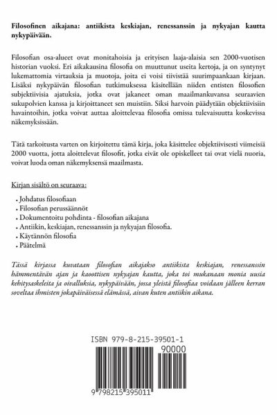 Filosofinen aikajana: antiikista keskiajan, renessanssin ja nykyajan kautta nykypäivään. Filosofian osa-alueet ovat monitahoisia ja erityisen laaja-alaisia sen 2000-vuotisen historian vuoksi. Eri aikakausina filosofia on muuttunut useita kertoja, ja on syntynyt lukemattomia virtauksia ja muotoja, joita ei voisi tiivistää suurimpaankaan kirjaan. Lisäksi nykypäivän filosofian tutkimuksessa käsitellään niiden entisten filosofien subjektiivisia ajatuksia, jotka ovat jakaneet oman maailmankuvansa seuraavien sukupolvien kanssa ja kirjoittaneet sen muistiin. Siksi harvoin päädytään objektiivisiin havaintoihin, jotka voivat auttaa aloittelevaa filosofia omissa tulevaisuutta koskevissa näkemyksissään. Tätä tarkoitusta varten on kirjoitettu tämä kirja, joka käsittelee objektiivisesti viimeisiä 2000 vuotta, jotta aloittelevat filosofit, jotka eivät ole opiskelleet tai ovat vielä nuoria, voivat luoda oman näkemyksensä maailmasta. Kirjan sisältö on seuraava:Johdatus filosofiaan Filosofian perussäännöt Dokumentoitu pohdinta - filosofian aikajana Antiikin, keskiajan, renessanssin ja nykyajan filosofia. Käytännön filosofia Päätelmä Tässä kirjassa kuvataan filosofian aikajakso antiikista keskiajan, renessanssin hämmentävän ajan ja kaoottisen nykyajan kautta, joka toi mukanaan monia uusia kehitysaskeleita ja oivalluksia, nykypäivään, jossa yleistä filosofiaa voidaan jälleen kerran soveltaa ihmisten jokapäiväisessä elämässä, aivan kuten antiikin aikana.