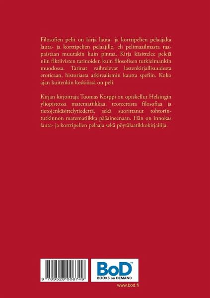Filosofien pelit on kirja lauta- ja korttipelien pelaajalta lauta- ja korttipelien pelaajille, eli pelimaailmasta raapaistaan muutakin kuin pintaa. Kirja käsittelee pelejä niin fiktiivisten tarinoiden kuin filosofisen tutkielmankin muodossa. Tarinat vaihtelevat lastenkirjallisuudesta eroticaan, historiasta arkirealismin kautta spefiin. Koko ajan kuitenkin keskiössä on peli.
