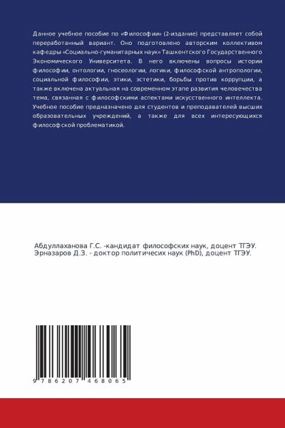 Dannoe uchebnoe posobie po 'Filosofii' (2-izdanie) predstawlqet soboj pererabotannyj wariant. Ono podgotowleno awtorskim kollektiwom kafedry 'Social'no-gumanitarnyh nauk' Tashkentskogo Gosudarstwennogo Jekonomicheskogo Uniwersiteta. V nego wklücheny woprosy istorii filosofii, ontologii, gnoseologii, logiki, filosofskoj antropologii, social'noj filosofii, ätiki, ästetiki, bor'by protiw korrupcii, a takzhe wklüchena aktual'naq na sowremennom ätape razwitiq chelowechestwa tema, swqzannaq s filosofskimi aspektami iskusstwennogo intellekta. Uchebnoe posobie prednaznacheno dlq studentow i prepodawatelej wysshih obrazowatel'nyh uchrezhdenij, a takzhe dlq wseh interesuüschihsq filosofskoj problematikoj.