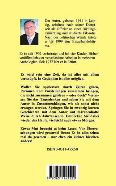 Es wird sein eine Zeit, da ist alles mit allem verknüpft. In Gedanken ist alles möglich. Wollen Sie spielerisch durch Zeiten gehen, Personen und Vorstellungen zusammen bringen, die nicht zusammen gehören - oder doch? Verlassen Sie das Tagesdenken und sehen Sie mit dem Autor in Zusammenhängen, wie sie sonst nicht erwogen werden. Springen Sie in zwanzig kurzen Geschichten mit dem Autor auf märchenhafte Weise durch Jahrtausende. Entdecken Sie dabei wieder das Heute, vielleicht auch etwas Morgen. Etwas Mut braucht es beim Lesen. Vor Überraschungen wird gewarnt! Denn: Es ist alles schon mal da gewesen - nur eben ein kleines bisschen anders!