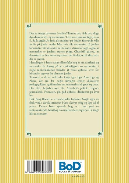 Der er mange dyrearter i verden! Tamme dyr, vilde dyr, kloge dyr, dumme dyr og mennesket? Den amerikanske læge Jonas E. Salk sagde; At hvis alle insekter på Jorden forsvandt, ville alt liv på jorden uddø. Men hvis alle mennesker på jorden forsvandt, ville alt andet liv blomstre. Attenborough sagde, at mennesket er jordens største plage. Churchill påstod, at demokrati er den værste styreform der findes, ud af alle andre der er prøvet. Handlingen i denne satire-filosofiske bog er om samfund og menneske. Et forsøg på at anskueliggøre os mennesker i nogle tankevækkende billeder af vores opførsel over for hinanden og over for planeten jorden. Talerøret er de tre velkendte kloge åger, Ego, Alter Ego og Nous, der ud fra nogle udvalgte emner diskuterer pædagogikken og filosofien om mennesket på godt og ondt. Her bliver begreber som bl.a. Apartheid, politik, religion, journalistik, Frimureri, pli, god opførsel diskuteret på livet løs. Erik Bang Boesen er en anderledes forfatter. Nogle siger en frisk vind i dansk litteratur. Hans skriver ærlig og lige ud af posen. Denne hans syvende bog er i høj grad en tankevækkende debatbog om udefinerbare begreber. Et klogt lille mesterværk.