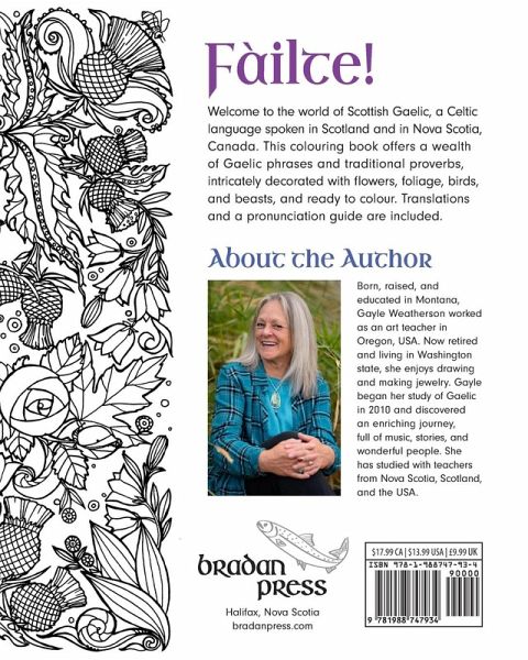 Fàilte...welcome to the world of Scottish Gaelic! This colouring book offers a wealth of phrases and traditional proverbs in Gaelic, intricately decorated with flowers, foliage, birds, and beasts, and ready to colour. Includes 30 black-and-white line drawings printed on one side on 70-lb. paper. Recommended for older children and adults due to the intricacy of the designs.