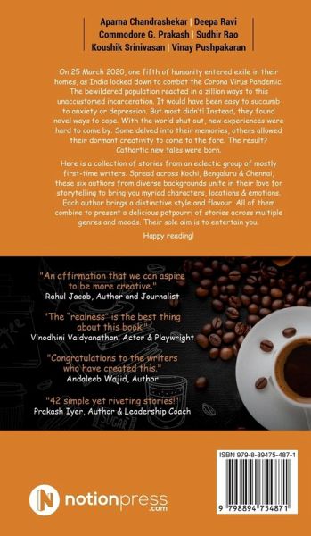 On 25 March 2020, one fifth of humanity entered exile in their homes, as India locked down to combat the Corona Virus Pandemic. The bewildered population reacted in a zillion ways to this unaccustomed incarceration. It would have been easy to succumb to anxiety or depression. But most didn't! Instead, they found novel ways to cope. With the world shut out, new experiences were hard to come by. Some delved into their memories, others allowed their dormant creativity to come to the fore. The result? Cathartic new tales were born. Here is a collection of stories from an eclectic group of mostly first-time writers. Spread across Kochi, Bengaluru & Chennai, these six authors from diverse backgrounds unite in their love for storytelling to bring you myriad characters, locations & emotions. Each author brings a distinctive style and flavour. All of them combine to present a delicious potpourri of stories across multiple genres and moods. Their sole aim is to entertain you. Happy reading! "An affirmation that we can aspire to be more creative." - Rahul Jacob, Author and Jounalist "The "realness" is the best thing about this book." -Vinodhini Vaidyanathan, Actor & Playwright "Congratulations to the writers who have created this." - Andaleeb Wajid, Author "42 simple yet riveting stories!" - Prakash Iyer, Author & Leadership coach