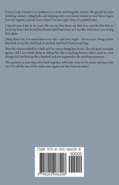 I swear, Luke Daniels is as stubborn as a mule and hung like a horse. He spends his time drinking whiskey, riding bulls, and sleeping with every horny woman in west Texas. I gave him my virginity and my heart when I was just a girl. Now, it's payback time… I haven't seen Luke in six years. He was my first lover, my first love, and the first boy to break my heart. But he had his dreams and I had mine, so I was fine with never ever seeing him again. Okay, that's a lie. I've missed him every day - and every night - for six years. I long to have him back in my life. And back in my bed. And back between my legs. Then he's almost killed by a bull and I'm sent to bring him home. The old spark instantly ignites. All I can think about is riding him like a bucking bronco, like I used to, even though he's stitched up like a baseball and not supposed to do anything strenuous. The question is, now that we're back together, will Luke come to his senses and stay with me? Or will the lure of the rodeo once again tear him from my arms?