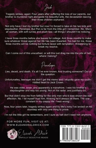 Jack Tragedy strikes, again. Four years after suffering the loss of our parents, our brother is murdered right alongside his beautiful wife, the devastation leaving their three children orphaned. Not only have I lost my brother but now I'm forced to take on his two kids and stepdauther, Penelope. But Pen is far from the little girl I remember. No. She's all woman, with soft curves and plush lips-all things I shouldn't be noticing. I have three months before she leaves for college. And three months to make sure whatever threat against her life has been thwarted. Too bad for me, those three months will be nothing but torture laced with temptation, threatening to break my resolve. Can I come out of this unscathed, or will this lust drag me into the pits of hell where I belong? Penelope Lies, deceit, and death. It's all I've ever known. And trusting someone? Out of the question. Unfortunatley, teenager me didn't get the memo and I stupidly gave my crush-riddled heart to Jack Crown. He was older, wiser, and apparently a manwhore. I was his brother's stepdaughter and way too young. Not on his radar, and justifiably so. But that didn't stop me from falling for the only man who'd ever shown me real affection. No. I let myself trust him, thinking he'd always be there. The one constant in my crappy life. I was wrong.. Now, four years later, tragedy strikes again and by life's irony I've landed on his doorstep with only one thing to prove. I'm not the little girl he remembers, and I sure as hell don't need him anymore. -