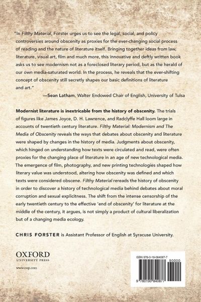 Modernist literature is inextricable from the history of obscenity. The trials of figures like James Joyce, D. H. Lawrence, and Radclyffe Hall loom large in accounts twentieth century literature. Filthy Material: Modernism and The Media of Obscenity reveals the ways that debates about obscenity and literature were shaped by changes in the history of media. Judgments about obscenity, which hinged on understanding how texts were circulated and read, were often proxies for the changing place of literature in an age of new technological media. The emergence of film, photography, and new printing technologies shaped how literary value was understood, altering how obscenity was defined and which texts were considered obscene. Filthy Material rereads the history of obscenity in order to discover a history of technological media behind debates about moral corruption and sexual explicitness. The shift from the intense censorship of the early twentieth century to the effective 'end of obscenity' for literature at the middle of the century, it argues, is not simply a product of cultural liberalization but of a changing media ecology. Filthy Material brings together media theory and archival research to offer a fresh account of modernist obscenity and novel readings of works of modernist literature. It sheds new light on figures at the center of modernism's obscenity trials (such as Joyce and Lawrence), demonstrates the relevance of the discourse obscenity to understanding figures not typically associated with obscenity debates (like T. S. Eliot and Wyndham Lewis), and introduces new figures to our account of modernism (like Norah James and Jack Kahane). It reveals how modernist obscenity reflected a contest over the literary in the face of new media technologies.