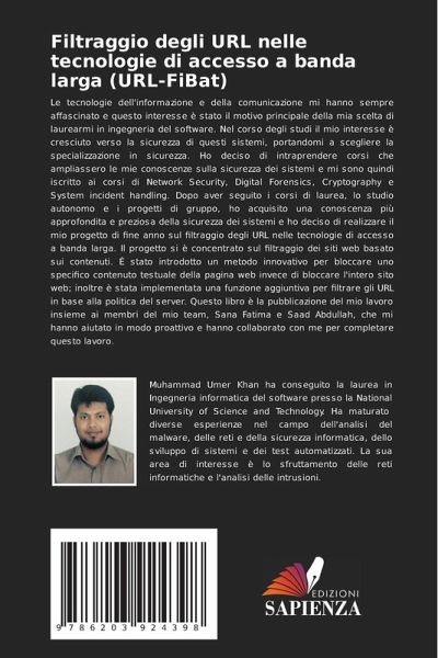 Le tecnologie dell'informazione e della comunicazione mi hanno sempre affascinato e questo interesse è stato il motivo principale della mia scelta di laurearmi in ingegneria del software. Nel corso degli studi il mio interesse è cresciuto verso la sicurezza di questi sistemi, portandomi a scegliere la specializzazione in sicurezza. Ho deciso di intraprendere corsi che ampliassero le mie conoscenze sulla sicurezza dei sistemi e mi sono quindi iscritto ai corsi di Network Security, Digital Forensics, Cryptography e System incident handling. Dopo aver seguito i corsi di laurea, lo studio autonomo e i progetti di gruppo, ho acquisito una conoscenza più approfondita e preziosa della sicurezza dei sistemi e ho deciso di realizzare il mio progetto di fine anno sul filtraggio degli URL nelle tecnologie di accesso a banda larga. Il progetto si è concentrato sul filtraggio dei siti web basato sui contenuti. È stato introdotto un metodo innovativo per bloccare uno specifico contenuto testuale della pagina web invece di bloccare l'intero sito web; inoltre è stata implementata una funzione aggiuntiva per filtrare gli URL in base alla politica del server. Questo libro è la pubblicazione del mio lavoro insieme ai membri del mio team, Sana Fatima e Saad Abdullah, che mi hanno aiutato in modo proattivo e hanno collaborato con me per completare questo lavoro.