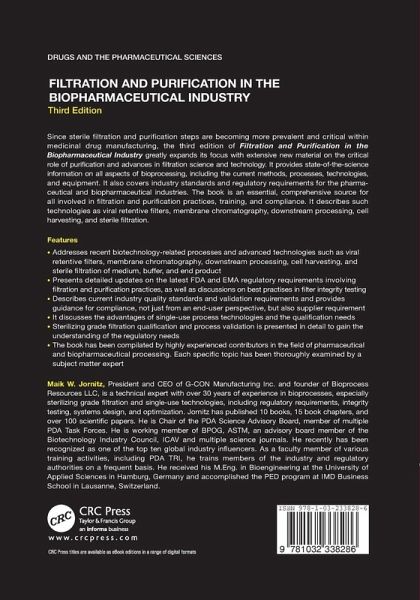 Since sterile filtration and purification steps are becoming more prevalent and critical within medicinal drug manufacturing, the third edition of Filtration and Purification in the Biopharmaceutical Industry greatly expands its focus with extensive new material on the critical role of purification and advances in filtration science and technology. It provides state-of-the-science information on all aspects of bioprocessing including the current methods, processes, technologies and equipment. It also covers industry standards and regulatory requirements for the pharmaceutical and biopharmaceutical industries. The book is an essential, comprehensive source for all involved in filtration and purification practices, training and compliance. It describes such technologies as viral retentive filters, membrane chromatography, downstream processing, cell harvesting, and sterile filtration.