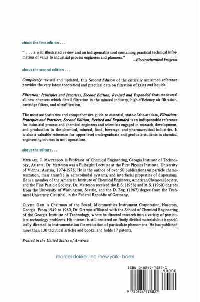 Completely revised and updated, this Second Edition of the critically acclaimed referenceprovides the very latest theoretical and practical data on filtration of gases and liquids