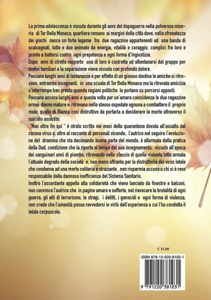 "Fin qui, non oltre"" è strato scritto nei mesi della quarantena dovuta all'assalto del corona virus e, oltre al racconto di personali vicende, l'autrice nel seguire l'evoluzione del dramma che sta decimando buona parte del mondo, è allarmata dalla pratica della Dad, condizione che la riporta al tempo del suo insegnamento vissuto all'epoca dei sanguinari anni di piombo, ritrovando nello sfascio di quella violenta lotta armata l'attuale degrado della società e non risparmia accuse a chi si è reso responsabile della dannosa inefficienza del Sistema Sanitario. Inoltre l'assordante appello alla solidarietà che viene lanciato da finestre e balconi, non convince l'autrice che in pagine amare e sofferte, nel rievocare la brutalità di ogni guerra e ogni forma di violenza, non crede che l'umanità possa ravvedersi in virtù dell'esperienza a cui l'ha condotta il letale corpuscolo.