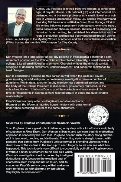 'Final Exam, ' is a Crime Fiction/Thriller. It's also a prequel to my last book, 'Blame it on the Moon, ' featuring several of the same characters. Don Weston left a long career of big-city policing in Philadelphia behind for a semi-retirement position as the Police Chief at Churchville University, a small liberal arts college. The new job is a pleasant slowdown from the urban career, allowing Don to pursue his other interests as an amateur Civil War historian and law enforcement consultant. Like all small liberal arts schools, Churchville faces the difficult survival struggles of declining enrollment, under endowment, and academic resistance to hard changes. The idyllic environment is increasingly threatened with uncertainty and the small community has become a hotbed of politics and administrative drama. Don is considering hanging up this career as well when the College Provost goes missing on a Monday and a preliminary investigation raises a number of questions for Don. Within days, another faculty member has committed suicide, and the body of the College President is discovered, gruesomely murdered, in the school auditorium. It falls on Don to pool the contacts and resources of his time in Philadelphia in solving a multi-faceted puzzle of clues and questionable relationships.