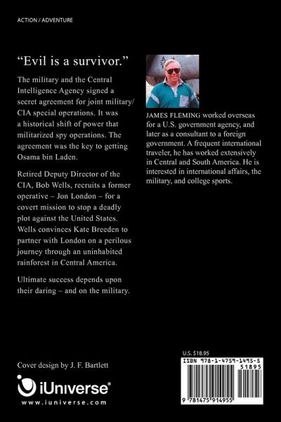 "Evil is a survivor." The military and the Central Intelligence Agency signed a secret agreement for joint military/ CIA special operations. It was a historical shift of power that militarized spy operations. The agreement was the key to getting Osama bin Laden. Retired Deputy Director of the CIA, Bob Wells, recruits a former operative - Jon London - for a covert mission to stop a deadly plot against the United States. Wells convinces Kate Breeden to partner with London on a perilous journey through an uninhabited rainforest in Central America. Ultimate success depends upon their daring - and on the military.