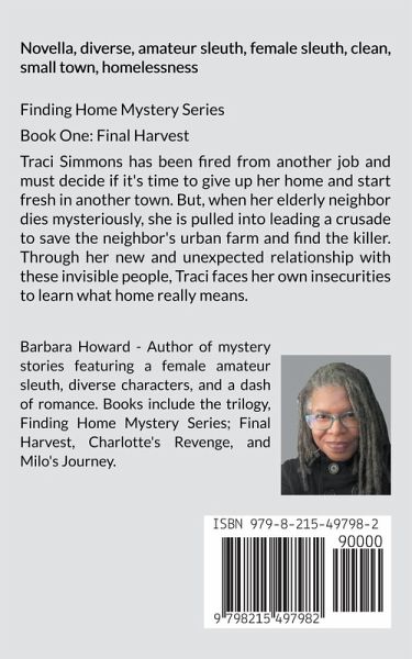 Novella, diverse, amateur sleuth, female sleuth, clean, small town Finding Home Mystery Series Book One: Final Harvest Traci Simmons has been fired from another job and must decide if it's time to give up her home and start fresh in another town. But, when her elderly neighbor dies mysteriously, she is pulled into leading a crusade to save the neighbor's urban farm and find the killer. Through her new and unexpected relationship with these invisible people, Traci faces her own insecurities to learn what home really means. Backdrop: Homelessness, anxiety, food insecurity, gentrification.