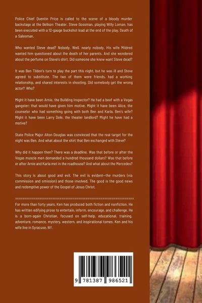 Police Chief Quentin Price is called to the scene of a bloody murder backstage at the Bellson Theater. Steve Gossman, playing Willy Loman, has been executed with a 12-gauge buckshot load at the end of the play, Death of a Salesman. Who wanted Steve dead? Nobody. Well, nearly nobody. His wife Mildred wanted him questioned about the death of her parents. And she wondered about the perfume on Steve's shirt. Did someone she knew want Steve dead? It was Ben Tilden's turn to play the part this night, but he was ill and Steve agreed to substitute. The two of them were friends, had a working relationship, and shared interests in shooting. Did somebody get the wrong actor? Who? Might it have been Arnie, the Building Inspector? He had a beef with a Vegas gangster; that would have given him motive. Might it have been Alice, the counselor who had something going with both Ben and Karla, Ben's wife? Might it have been Larry Dole, the theater landlord? Might he have had a motive? State Police Major Alton Douglas was convinced that the real target for the night was Ben. And what about the shirt that Ben exchanged with Steve? Why did it happen then? There was a deadline. Was that before or after the Vegas muscle men demanded a hundred thousand dollars? Was that before or after Arnie and Karla met in the roadhouse? And what about the Mercedes? Shakespeare said, "The evil that men do lives after them; the good is oft interred with their bones." The Bible says that the destination of those who do evil will be Hell, without recourse. This story is about good and evil. The evil is evident-the murders (via commission and omission) and those involved. The good is the good news and redemptive power of the Gospel of Jesus Christ.