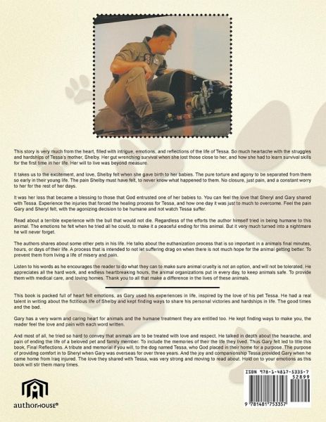 This story is very much from the heart, filled with intrigue, emotions, and reflections of the life of Tessa. So much heartache with the struggles and hardships of Tessa's mother, Shelby. Her gut wrenching survival when she lost those close to her, and how she had to learn survival skills for the first time in her life. Her will to live was beyond measure. It takes us to the excitement, and love, Shelby felt when she gave birth to her babies. The pure torture and agony to be separated from them so early in their young life. The pain Shelby must have felt, to never know what happened to them. No closure, just pain, and a constant worry to her for the rest of her days. It was her loss that became a blessing to those that God entrusted one of her babies to. You can feel the love that Sheryl and Gary shared with Tessa. Experience the injuries that forced the healing process for Tessa, and how one day it was just to much to overcome. Feel the pain Gary and Sheryl felt, with the agonizing decision to be humane and not watch Tessa suffer. Read about a terrible experience with the bull that would not die. Regardless of the efforts the author himself tried in being humane to this animal. The emotions he felt when he tried all he could, to make it a peaceful ending for this animal. But it very much turned into a nightmare he will never forget. The authors shares about some other pets in his life. He talks about the euthanization process that is so important in a animals final minutes, hours, or days of their life. A process that is intended to not let suffering drag on when there is not much hope for the animal getting better. To prevent them from living a life of misery and pain. Listen to his words as he encourages the reader to do what they can to make sure animal cruelty is not an option, and will not be tolerated. He appreciates all the hard work, and endless heartbreaking hours, the animal organizations put in every day, to keep animals safe. To provide them with medical care, and loving homes. Thank you to all that make a difference in the lives of these animals.