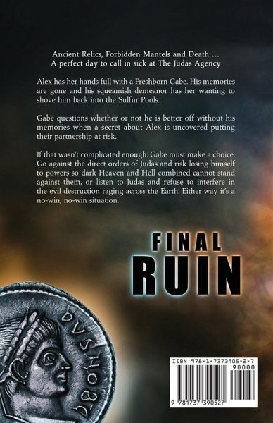 Ancient Relics, Forbidden Mantels and Death ... A perfect day to call in sick at The Judas Agency Alex has her hands full with a Freshborn Gabe. His memories are gone and his squeamish demeanor has her wanting to shove him back into the Sulfur Pools. Gabe questions whether or not he is better off without his memories when a secret about Alex is uncovered putting their partnership at risk. If that wasn't complicated enough. Gabe must make a choice. Go against the direct orders of Judas and risk losing himself to powers so dark Heaven and Hell combined cannot stand against them, or listen to Judas and refuse to interfere in the evil destruction raging across the Earth. Either way it's a no-win, no-win situation. If you like snarky characters and dark humor, then you'll love Final Ruin, the fifth and final book in the action-packed Judas Files urban fantasy series. Series now complete!
