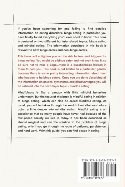 If you've been searching for and failing to find detailed information on eating disorders, binge eating in particular, you have finally found everything you'll ever need to know. This book is centered on two different but interrelated topics; binge eating and mindful eating. The information contained in this book is relevant to both binge eaters and non-binge eaters. This book will enlighten you on the risk factors and triggers for binge eating. You might be a binge eater and not even know it, so be sure not to miss a page...there is a questionnaire hidden in there to help you. This book is not limited to a particular gender because there is some pretty interesting information about men who happen to be binge eaters. Once you are done absorbing all the information on causes, symptoms, and disadvantages, you will be ushered into the next major topic - mindful eating. Mindfulness is like a canopy with little mindful behaviors underneath, but the focus of this book is mindful eating in relation to binge eating, which can also be called mindless eating. As usual, you will be taken through the world of mindfulness before going a little deeper into mindful eating. Mindful eating is an experience that so many people have never had because of the fast-paced society we live in today. It has been described as almost magical and can the solution to the problem of binge eating, only if you go through the route of patience, persistence, and hard work. With this guide, you can find peace in eating.