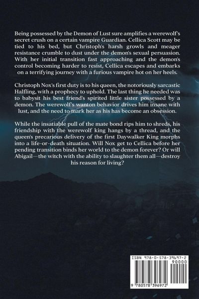 A girl, a werewolf, and a demon walk into a bar. Unfortunately, they're all the same person with an enraged vampire hot on their heels. Being possessed by the Demon of Lust sure amplifies a werewolf's secret crush on a certain vampire Guardian. Cellica Scott may be tied to his bed, but Christoph's harsh growls and meager resistance crumble to dust under the beast's erotic seduction. With her initial transition fast approaching and the demon's control becoming tougher to combat, Cellica escapes and embarks on a terrifying journey with a furious vampire hot on her heels. Christoph Nox's first loyalty is to his queen, the notoriously sarcastic Halfling, with a prophecy to uphold. The last thing he needed was to babysit his best friend's spirited little sister possessed by a Prince of Hell. The werewolf's wanton behavior drives him mad with lust, and the need to mark her as his has become an obsession. With the insatiable pull of the mate bond ripping him apart, his friendship with the Werewolf King hanging in the balance, the queen's birth of the first Daywalker King transforms into life-or-death. Will Nox get to Cellica before her pending transformation forever binds her soul to the demon? Or will Abigail-the witch with the ability to slaughter them all-destroy his reason for living? Author Note: If things like violence, blood, gore, references to rape, consensual BDSM play with explicit sexual scenes, menage play, graphic language, and demons are triggers for you, then move along; this is NOT the book for you. In fact, my entire Storm series is NOT for you.