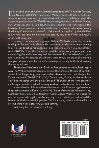 In his second book about the coming horrendous WWIII nuclear fire war, Final Warning: WWIII Part Two, Gabriel Michaels deals with several end-time subjects. Among these are the rise of the Antichrist and the false prophet; the extensive preparations for WWIII that are being done by the United States, NATO, Russia, and Russia's prophetic allies; and the end-time signs in the heavens. He also examines the question that everyone wants to know concerning the timing of Jesus's return--when? I think you will be surprised by what God has shown him about this and how close we actually may be to WWIII and Jesus's return at the Rapture. In easy-to-understand language, Gabriel Michaels shows that time is running out for man's rule of earth. He shows how and why Jesus truly is coming to earth soon to set up his kingdom of one thousand years. If you have already read WWIII Part One, then, once you read this book, many of your questions concerning the end-times may well be answered. For the sake of you, your family, and your friends, you should know these things. We are quickly moving to a great climax in world history. This could quite literally be the final warning that many will hear. The sunset of man's rule over Earth, his final generation to rule Earth, began May 14, 1948, when Israel became a nation. The sunrise of the rule of Earth by Jesus Christ, King of kings, is upon us and very few understand that. The prophet Daniel was told in Daniel 12:9 (NIV), "Go your way, Daniel, for the words are closed up and sealed until the time of the end." The words of end-time prophecy are being unsealed in this book in a way you have probably never heard before. You can be one of those in the end-times, who would be among the wise, as the prophet was told in Daniel 12:10 (NIV), "None of the wicked will understand, but those who are wise will understand." Author Gabriel Michaels has studied for over fifty years to bring this word of warning to you, to help you understand the lateness of the hour in which you live. This is a warning done out of love. Please listen, before it's too late! King Jesus is coming. Get ready for the return of the King!